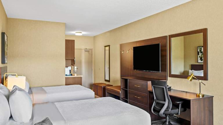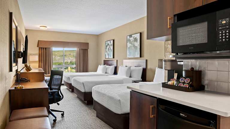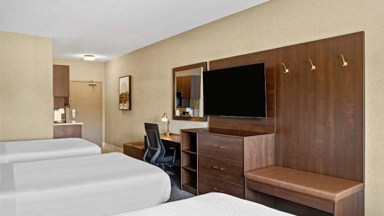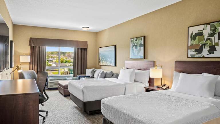 Die Zimmer im Ramada by Wyndham Drumheller Hotel & Suites sind geräumig und bieten eine moderne Ausstattung. Jedes Zimmer verfügt über eine Klimaanlage, ein bequemes Doppelbett, einen Schreibtisch, Kabel-TV und kostenfreies WLAN. Zusätzlich sind eine Mikrowelle, ein Mini-Kühlschrank sowie Tee- und Kaffeezubehör vorhanden.