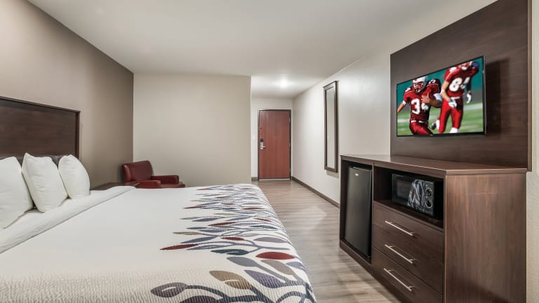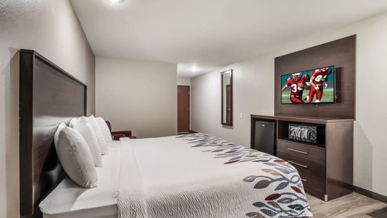 Die Zimmer sind in warmen Farben gehalten und verfügen über moderne Annehmlichkeiten wie Flachbild-Kabel-TV, Mikrowelle und kleinen Kühlschrank. Haustiere sind erlaubt, bis zu zwei Tiere pro Zimmer, wobei der Aufenthalt für das erste Haustier kostenfrei ist. Auf Wunsch werden Babybetten bereitgestellt.