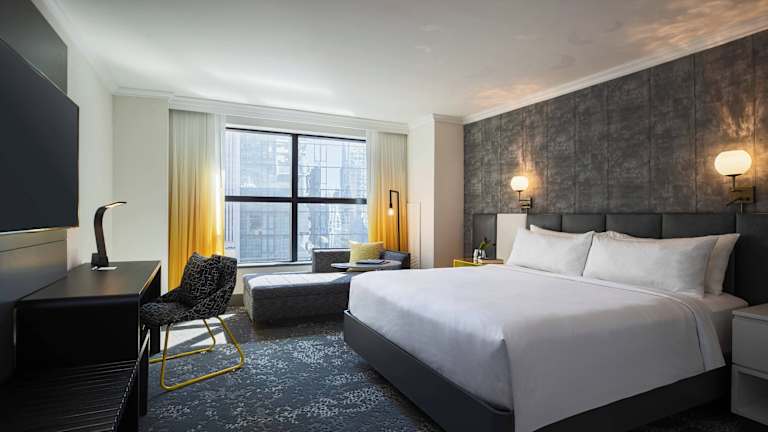 Das Renaissance New York Times Square Hotel verfügt über 312 schallisolierte Zimmer auf 26 Etagen. Jedes Zimmer ist stilvoll eingerichtet und bietet den Gästen einen komfortablen Rückzugsort inmitten des Trubels der Stadt. Die Zimmer sind mit den typischen Betten und Bettwäsche des Hotels Renaissance ausgestattet und verfügen über dunkle Holzmöbel und goldblaue Akzente. Von den raumhohen Fenstern aus genießen die Gäste einen atemberaubenden Blick auf die Stadt. Zur weiteren Ausstattung gehören ein Flachbild-TV, eine Minibar und kostenfreies WLAN.