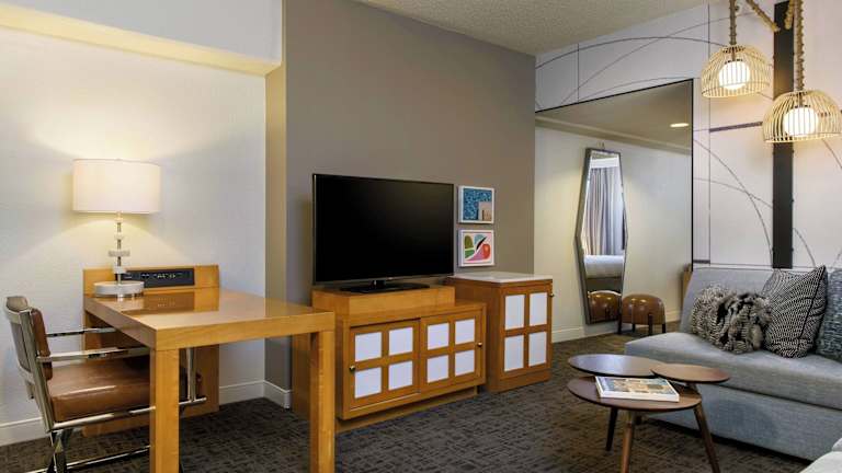 Die hellen Zimmer im Renaissance Palm Springs Hotel sind geschmackvoll eingerichtet und verfügen über modernes Mobiliar. Jedes Zimmer ist mit einem LCD-TV, einer iPod-Dockingstation, einer Kaffeemaschine und einem Bügeleisen/-brett ausgestattet. Die großen Fenster bieten einen herrlichen Blick auf die San Jacinto Mountains.