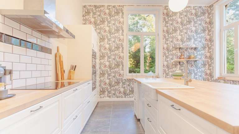 Die Villa verfügt über eine komplett ausgestattete Küche, einschließlich Kühlschrank, Geschirrspüler und Ofen, sowie über einen Essbereich.