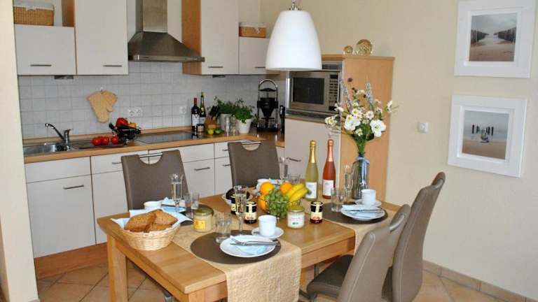 Die Unterkunft verfügt über eine voll ausgestattete Küche mit Kühlschrank und Geschirrspüler, jedoch sind keine weiteren Informationen zu Verpflegungsmöglichkeiten vorhanden.