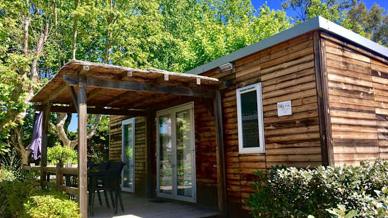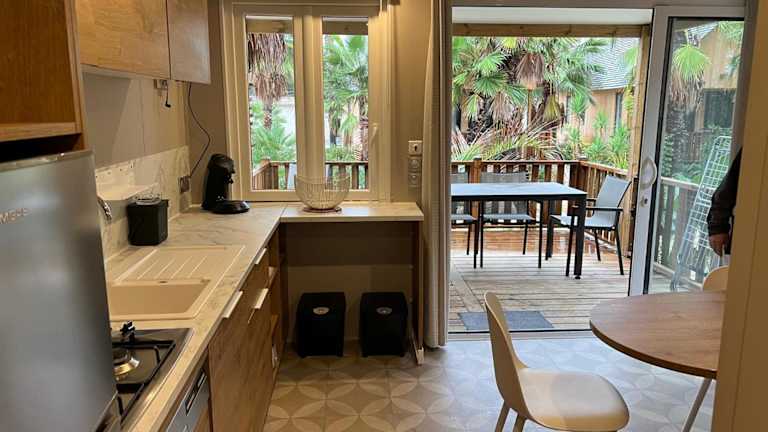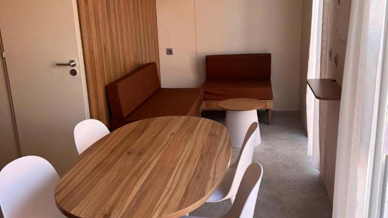 Jedes Mobilheim ist mit einem Flachbildfernseher und einer Klimaanlage ausgestattet. Die Badezimmer verfügen über eine Dusche, und eine offene Küchenzeile mit Mikrowelle, Kühlschrank und Herd ist ebenfalls vorhanden.