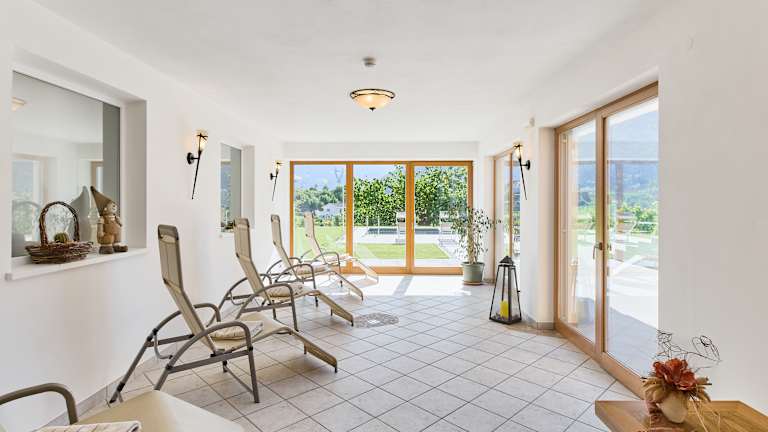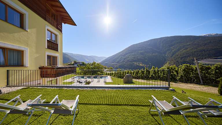 Im Sommer bietet der hauseigene Garten inmitten blühender Obstgärten und Apfelwiesen viel Raum für Ruhe, Erholung und Entspannung. Für Spaß und Abkühlung sorgt das hauseigene Freischwimmbecken im großen Garten. Wer es gerne gemütlich hat, kann sich unterm Sonnenschirm ausruhen und entspannen. Nach einem aktiven Tag im Freien bietet die hauseigene Sauna den idealen Rahmen für Entspannung und Wohlbefinden. Durch den direkten Zugang ins Freie könnt Ihr Euch auch mal im frischen Pulverschnee abkühlen und regenerieren. Oder ihr macht es Euch im Whirlpool gemütlich, der direkt vom Saunabereich aus zugänglich ist. - Finnische Vollholzsauna - Ruheraum mit Liegestühlen und Blick auf die umliegende Bergwelt - Verschiedene Duschvarianten, die die Haut massieren und die Durchblutung anregen - Handtücher für Sauna kostenlos verfügbar - Zur Abkühlung: direkter Zugang ins Freie - Whirlpool im Garten