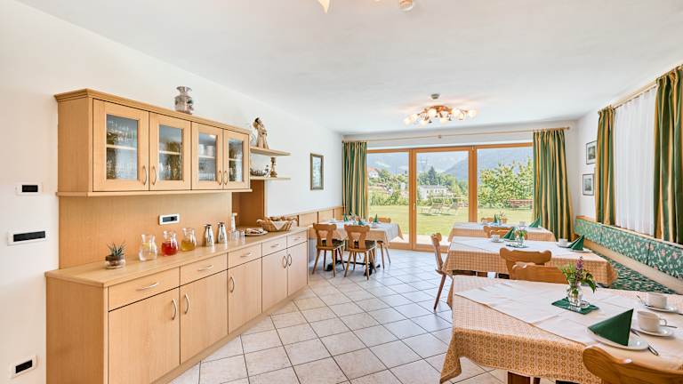Unsere Ferienwohnungen mit Frühstück im Eisacktal punkten mit hausgemachten Fruchtaufstrichen, Butter, Käse, Eiern, Wurst, frischem Brot, Säften, Honig, Joghurt, Obst und Süßspeisen. Alle angebotenen Speisen kommen aus der unmittelbaren Region. Der Frühstücksraum bietet einen herrlichen Blick auf die Umgebung und die Berge. Durch den direkten Zugang ins Freie könnt Ihr im Sommer Euren Kaffee auch im Garten genießen.