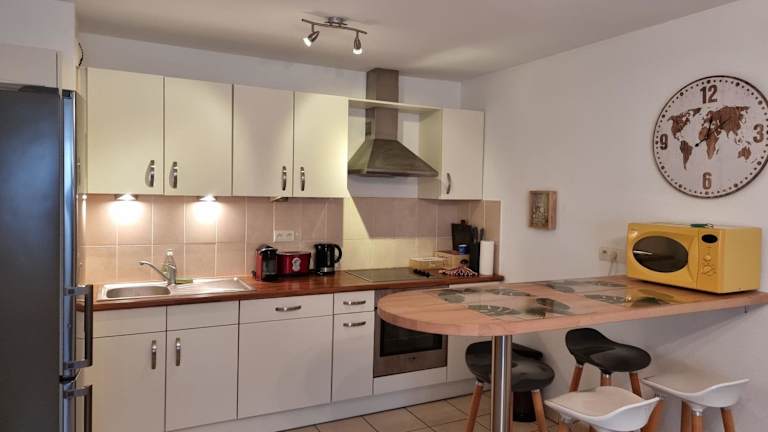 Die Ferienwohnung beinhaltet ein Schlafzimmer, ein Wohnzimmer, eine voll ausgestattete Küche mit Kühlschrank und Kaffeemaschine sowie ein Badezimmer mit Badewanne und kostenlosen Pflegeprodukten. Handtücher und Bettwäsche werden bereitgestellt.