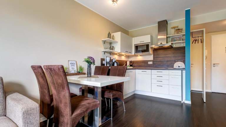 Die Ferienwohnung umfasst 1 Schlafzimmer, ein Wohnzimmer, eine voll ausgestattete Küche mit Kühlschrank und Kaffeemaschine sowie ein Badezimmer mit Dusche und Haartrockner. Handtücher und Bettwäsche werden bereitgestellt.