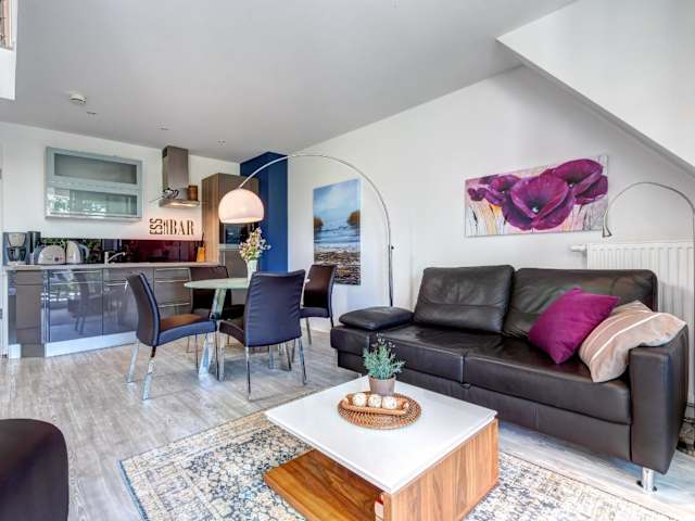 Die Ferienwohnung bietet ein Schlafzimmer sowie eine vollständig ausgestattete Küche mit Kühlschrank und Geschirrspüler. Sie verfügt zudem über ein Badezimmer mit Dusche, Haartrockner und Waschmaschine. Handtücher und Bettwäsche werden bereitgestellt. Die Unterkunft ist komplett rauchfrei.