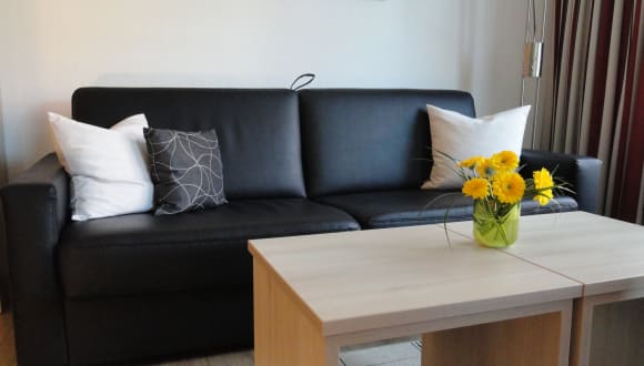 Unsere Ferienwohnung besteht aus: Wohn-/Schlafraum mit separatem Essplatz: - modern eingerichteter Wohnraum - Balkon mit Westausrichtung - kostenloser W-LAN/LAN Internetzugang - LED Fernseher mit SKY (Cinema, Sport 1, Fußball-Bundesliga, Disney Cinemagic) - Blu-Ray Heimkino-System mit Radio, DVD und iPod/Phone Dock - eine Auswahl von Spielesammlungen, Büchern und DVDs - Wohn-/Schlafsofa (Liegefläche 170 x 200 cm, Sitzpolsterung komplett wegklappbar mit eigenständiger Kaltschaummatratze) - Verdunkelungsgardinen - Rauchmelder - Essplatz für bis zu vier Personen Schlafzimmer: - großes Doppelbett (2 Matratzen 100x200 cm) - Lattenrost mit verstellbarem Kopf- und Fußteil - großer Schiebetürenschrank - 2. Zugang zum Balkon - Verdunkelungsgardinen - Rauchmelder - LED Fernseher 32" mit SKY (Cinema, Sport 1, Fußball-Bundesliga, Disney-Cinemagic) Küche: - Kühlschrank mit Gefrierfach - Mikrowelle - Ceranfeld mit 4 Kochstellen - Backofen mit Grill und Heißluft - Dunstabzug - Spülmaschine - Kaffeemaschine, Toaster, Wasserkocher, Eierkocher - Waage, Mixer - Geschirr, Gläser, Besteck, Töpfe, Pfannen und Schüsseln in ausreichender Anzahl Bad: - Hänge WC (in Komforthöhe) - Dusche bzw. Duschkabine 80x100 cm - Waschbecken - zwei geflieste Ablagen, Regal - Handtuchhalter, zwei Badehandtuchhalter - Handtuchheizkörper - Föhn - Kosmetikspiegel - Kinderhocker Garderobe/Abstellraum: - getrennt durch Schiebetür mit großem Spiegel - Kofferfach - Rauchmelder - Einbauschrank mit Staubsauger, Bügeleisen, Bügelbrett, Wäscheständer, Putzgeräten und Reinigungsmitteln - Einbauschrank zur freien Verfügung, z.B. für die Gäste, die im Wohnzimmer übernachten Balkon: - Sitzmöglichkeiten für bis zu vier Personen - Westausrichtung - Abendsonne genießen Allgemein: - kostenloser Wellnessbereich mit Schwimmbad, Sauna, Dampfbad und Infrarotkabine - Tresor in der Wohnung - Erste-Hilfe-Set - Klingel mit Gegensprechanlage - Fahrstuhl im Haus - eigener kostenloser PKW Stellplatz in der Tiefgarage - Fahrradraum - Spielplatz - Münzwaschmaschine bzw. -trockner im Haus - Kofferkuli steht im Fahrradraum bereit - Nichtraucherwohnung - Haustiere sind nicht erlaubt - Strandkorbverleih zu besonders günstigen Preisen Freizeitbereich: Der Freizeitbereich - dieser befindet sich im Haus 4 - besteht aus Schwimmbad, Sauna, Dampfbad und Infrarotkabine. Die Benutzung ist für unsere Gäste kostenlos. Öffnungszeiten täglich: Schwimmbad 7 - 21 Uhr Sauna 15 - 21 Uhr