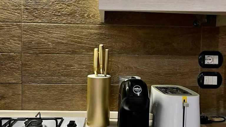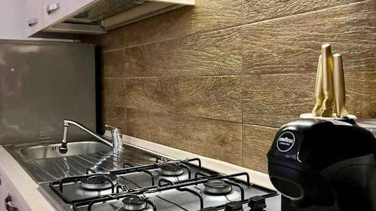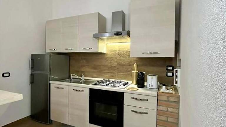 Die Küche der Residenza Corrado ist ausgestattet mit einem Kühlschrank, einem Ofen, einer Mikrowelle und einer Kaffeemaschine.