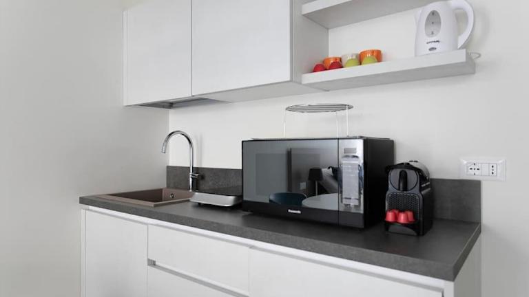 Die Küchenzeile in der Ferienwohnung ist mit einem Kühlschrank, einer Mikrowelle, einer Herdplatte, einer Kaffeemaschine und einem Wasserkocher ausgestattet.