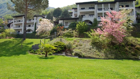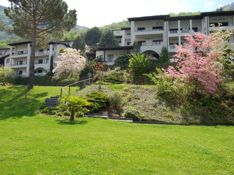 Grosse und gepflegte Gartenanlage mit Schwimmbad, Fitness, Schach, Ping-Pong, Spielplatz und Rustico mit Grill. Zusätzlicher Service: Frisches Brot am morgen.