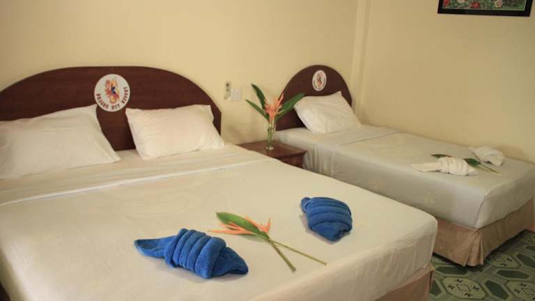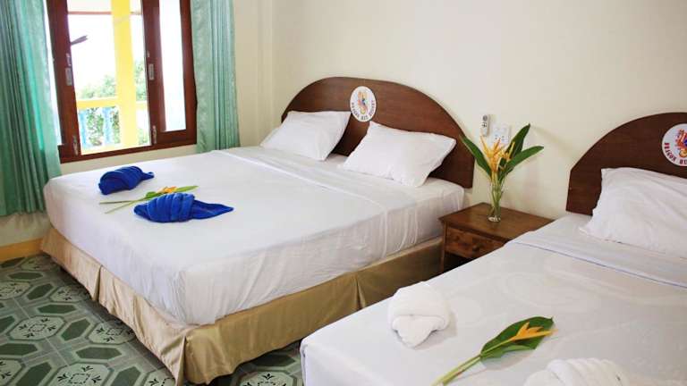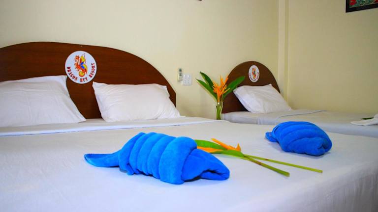 Die Bungalows im Dragon Hut Resort sind komfortabel eingerichtet und verfügen über eine eigene Terrasse mit Meerblick. Die Bungalows sind entweder mit Klimaanlage oder einem Ventilator ausgestattet und verfügen über ein eigenes Bad mit Dusche. Einige Bungalows bieten auch einen Fernseher, einen DVD-Player und einen Kühlschrank. Die Fliesenböden sorgen für eine angenehme Kühlung in den Zimmern.