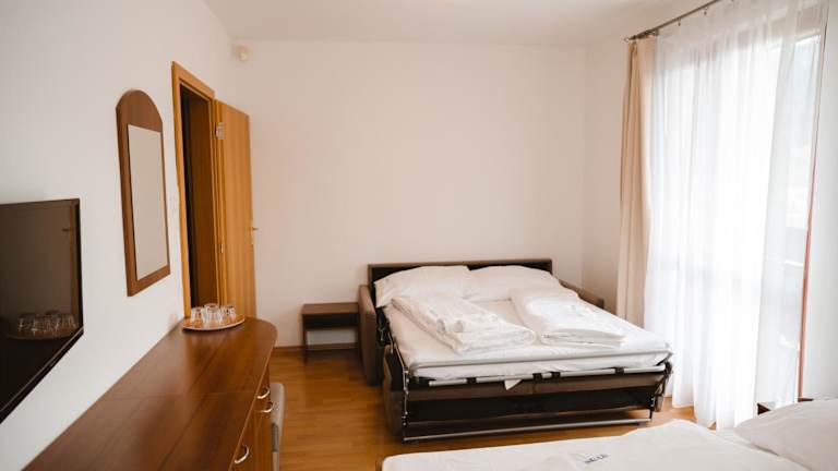 Die Zimmer sind ausgestattet mit einem Schreibtisch, einem Balkon mit Bergblick, einem eigenen Badezimmer, einem Flachbild-TV, Bettwäsche und Handtüchern. Einige Zimmer bieten zudem eine Küchenzeile mit Kühlschrank, Mikrowelle und Herdplatte. Alle Gästezimmer verfügen über einen Kleiderschrank. Es sind sowohl Nichtraucher- als auch Familienzimmer verfügbar.