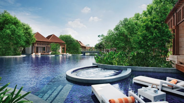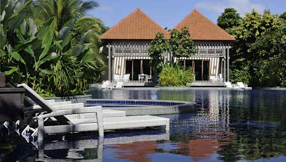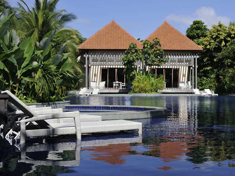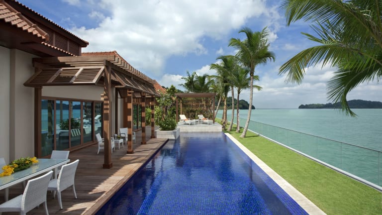 Das Resorts World Sentosa - Equarius Villas bietet luxuriöse Villen mit eigenem Pool und atemberaubendem Panoramablick auf das Meer und den umliegenden Wald. Die Villen sind modern ausgestattet und bieten Annehmlichkeiten wie eine Nespresso-Kaffeemaschine, ein iHome-System und ein komfortables Bett. Das Hotel liegt an der Westspitze der Insel Sentosa und bietet eine entspannte Atmosphäre inmitten von tropischem Grün. Mit seinem exzellenten Service, einschließlich persönlicher Butler und Transport-Buggys, sorgt das Hotel für Ihren Komfort. Genießen Sie auch die gastronomischen Einrichtungen des Resorts World Sentosa - Equarius Hotel, das nur wenige Gehminuten entfernt liegt.