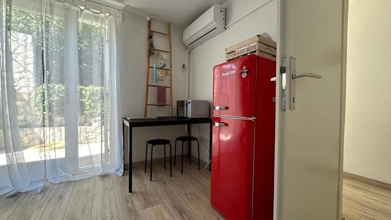 Retro room-Vis-Rukavac bietet eine Ferienwohnung mit einer Terrasse und Blick auf den Garten. Die Unterkunft ist klimatisiert und beinhaltet ein Schlafzimmer sowie ein Badezimmer mit Dusche. Die Einrichtung umfasst Handtücher und Bettwäsche.