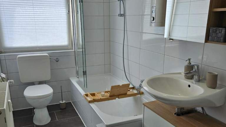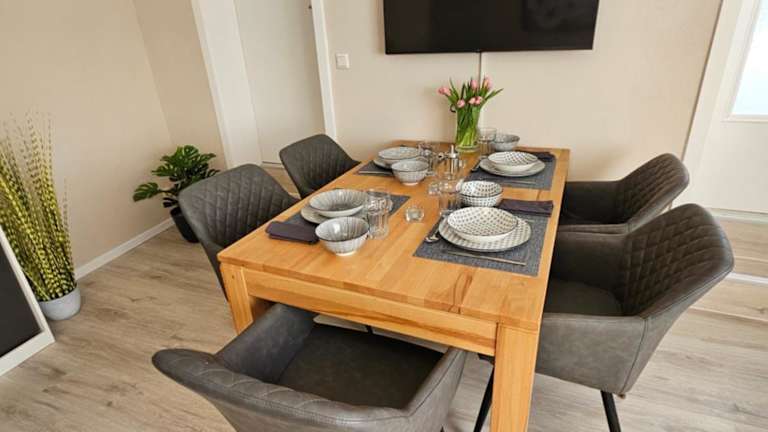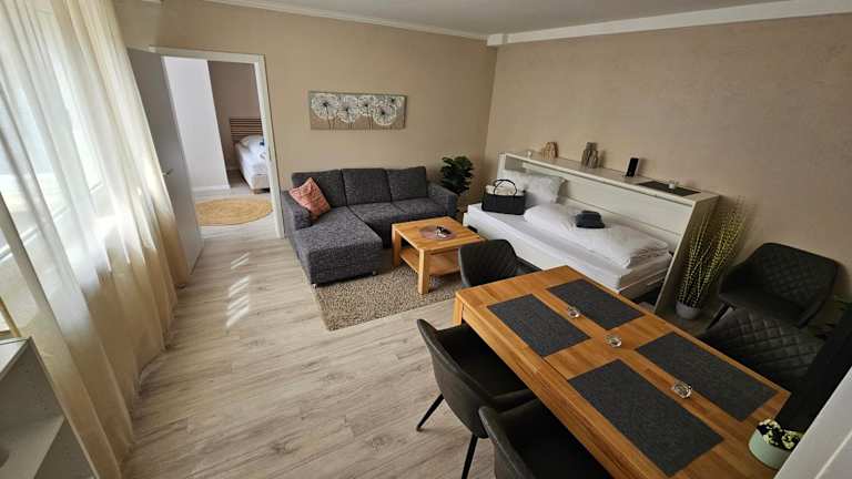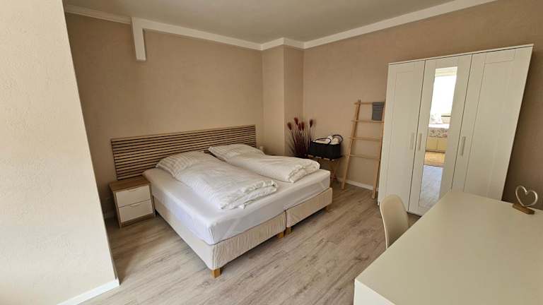 Die Ferienwohnung besteht aus einem Schlafzimmer, einem Wohnzimmer und einer voll ausgestatteten Küche, die mit einem Kühlschrank und einer Kaffeemaschine ausgestattet ist. Zudem gibt es ein Badezimmer mit Dusche und Haartrockner. Handtücher und Bettwäsche werden zur Verfügung gestellt.