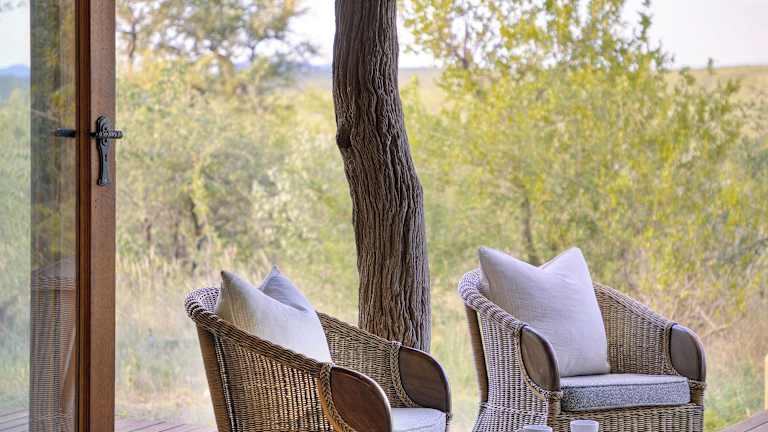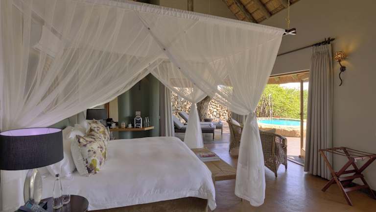 Die Zimmer der Rhulani Safari Lodge sind klimatisiert und bieten private Terrassen mit Tauchbecken und Sonnenliegen. Die Ausstattung umfasst ein Doppelbett, einen Sitzbereich und ein eigenes Bad mit Dusche und Badewanne. Auch ein Safe und eine Minibar sind vorhanden. Es sind rollstuhlgerechte Zimmer verfügbar.