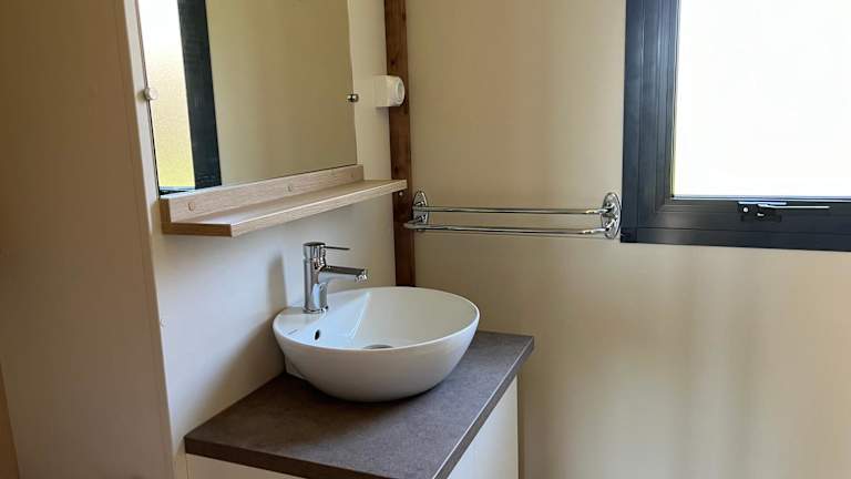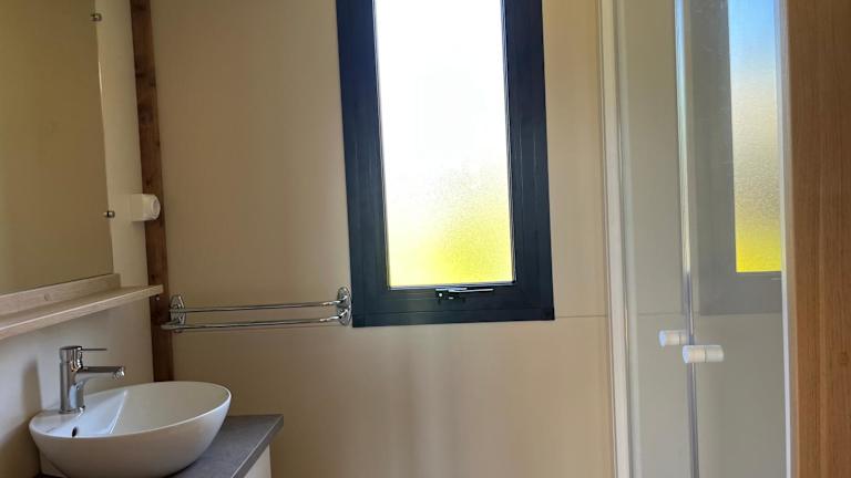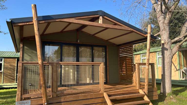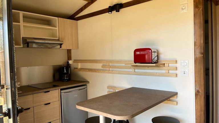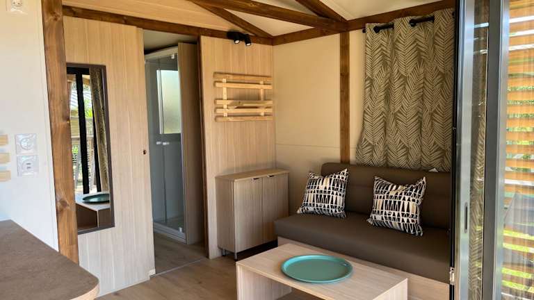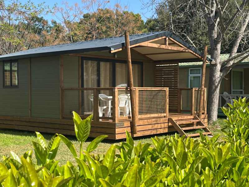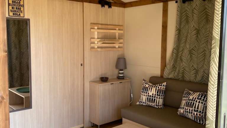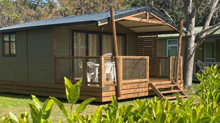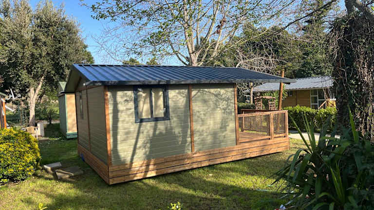 Ri-Veu corse dans camping marina di sorbo bietet Übernachtungsmöglichkeiten mit Klimaanlage sowie Zugang zu einem Garten mit einer Terrasse.