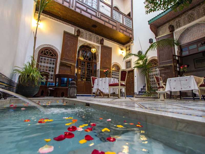 Beginnen Sie Ihren Tag mit einem kontinentalen Frühstück im Innenhof oder im Speisesaal, während Sie den Klang des Brunnens im Hintergrund genießen. Im Restaurant des Riads können Sie lokale Spezialitäten probieren und in der Bar auf der mittleren Etage können Sie marokkanischen Tee genießen.