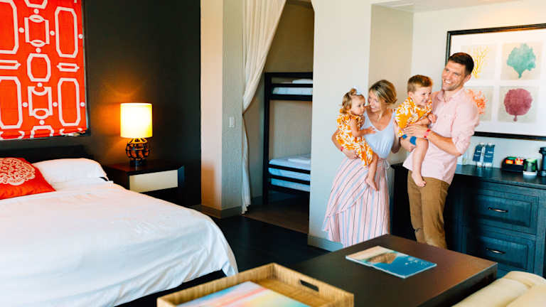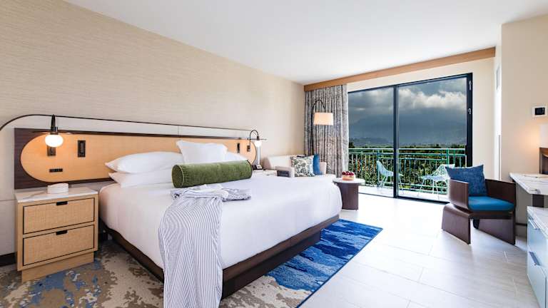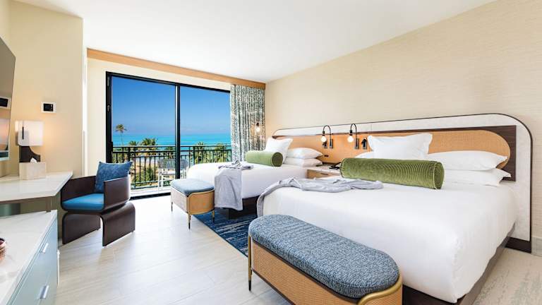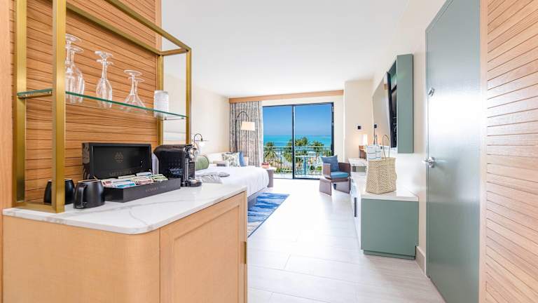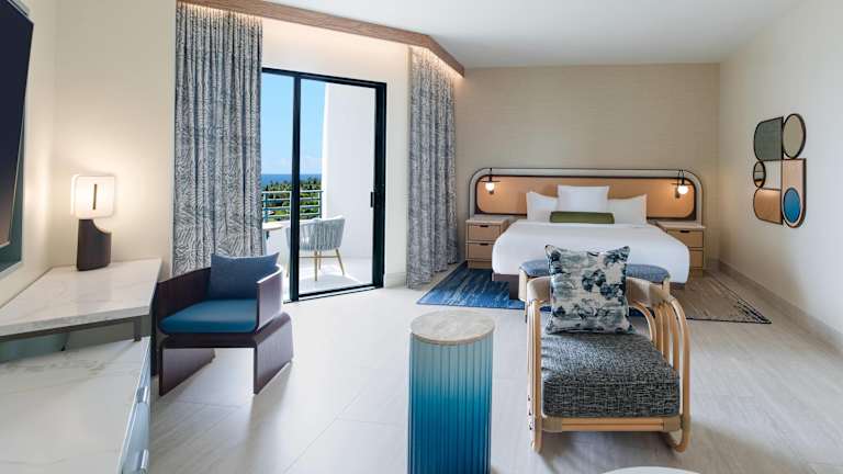 Die Zimmer sind klimatisiert und verfügen über einen Balkon, teilweise mit Meerblick. Ausgestattet sind sie mit einem Kingsizebett, einer Minibar, einem Safe und einem TV. Zusätzlich stehen ein Kühlschrank, eine Tee- und Kaffeemaschine sowie ein eigenes Badezimmer mit Dusche und Badewanne zur Verfügung. WLAN ist kostenfrei und rollstuhlgerechte Zimmer sind buchbar.