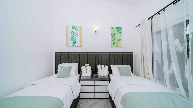 Das Ferienhaus besteht aus 2 separaten Schlafzimmern, einem Wohnzimmer sowie einer voll ausgestatteten Küche mit Kühlschrank und Ofen. Zudem stehen 2 Badezimmer zur Verfügung. Handtücher und Bettwäsche werden in der Unterkunft bereitgestellt.