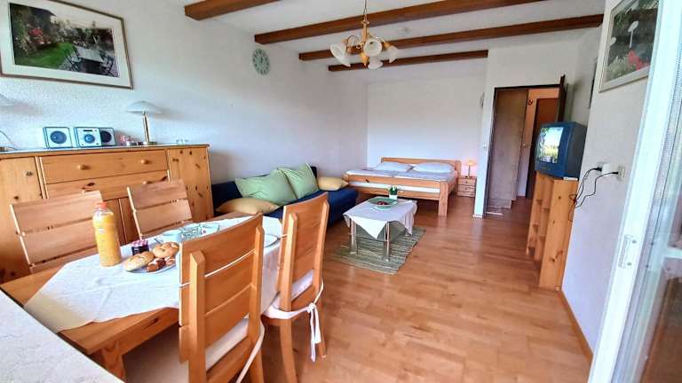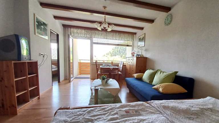 Das Seeappartement ist mit 2 Schlafzimmern, einer Küchenzeile mit Kühlschrank und Geschirrspüler sowie einem Badezimmer mit Badewanne ausgestattet. Handtücher und Bettwäsche können gegen Aufpreis bereitgestellt werden.
