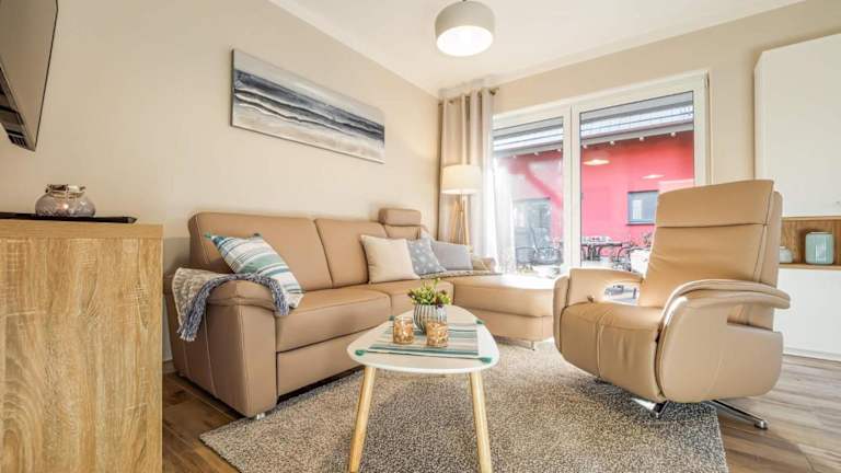 Das Apartment im Erdgeschoss bietet 2 Schlafzimmer, eine gut ausgestattete Küche mit Kühlschrank und Backofen sowie ein gemütliches Wohnzimmer. Der TV sorgt für Unterhaltung und die Terrasse lädt zum Entspannen ein.