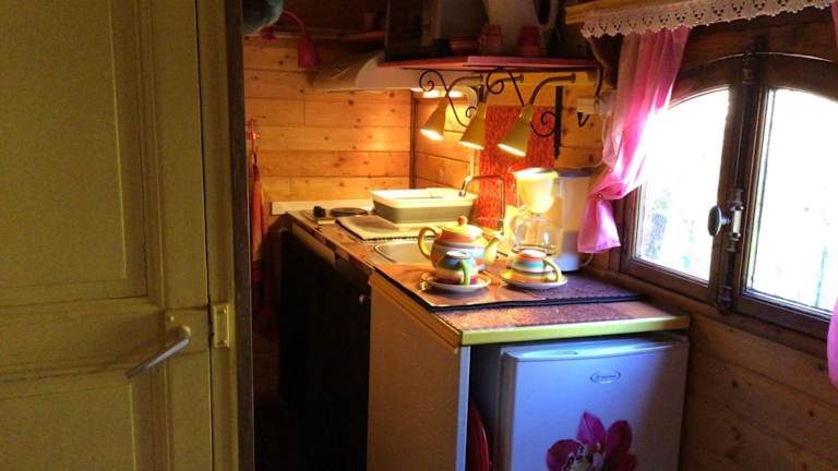 Das Roulotte Fenouillet ist ein klimatisiertes, luxuriöses Zelt mit einem Essbereich, einer voll ausgestatteten Küche und einem TV. Das Zelt bietet Platz für erholsame Nächte und bietet Ihnen eine komfortable und stilvolle Unterkunft.