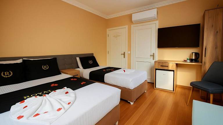 Die Gästezimmer des Royal Hotel Kumkapı sind mit einer Kaffeemaschine und einem eigenen Badezimmer ausgestattet, das kostenlose Pflegeprodukte enthält. Jedes Zimmer verfügt über einen Flachbild-TV und Klimaanlage. Bestimmte Zimmer sind zudem mit einer Terrasse ausgestattet. Die Unterkunft stellt Bettwäsche und Handtücher zur Verfügung.