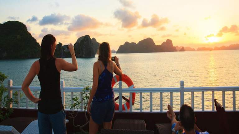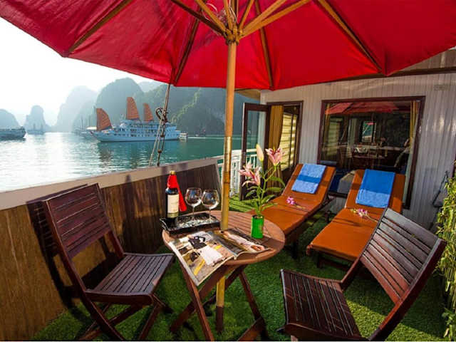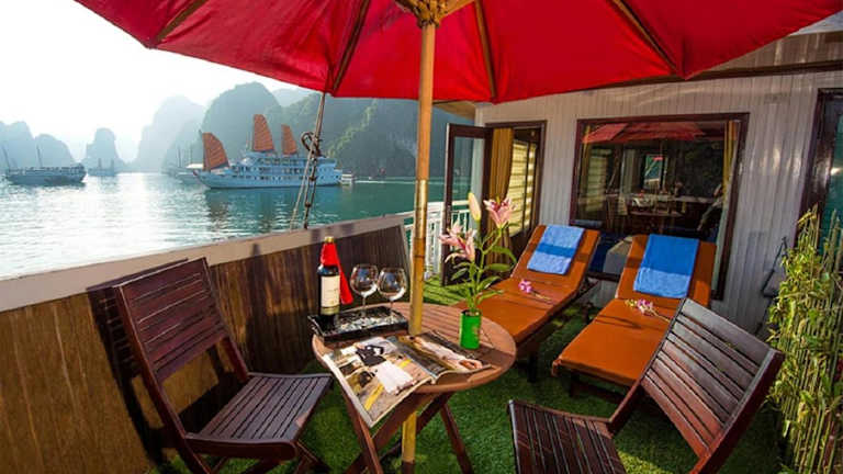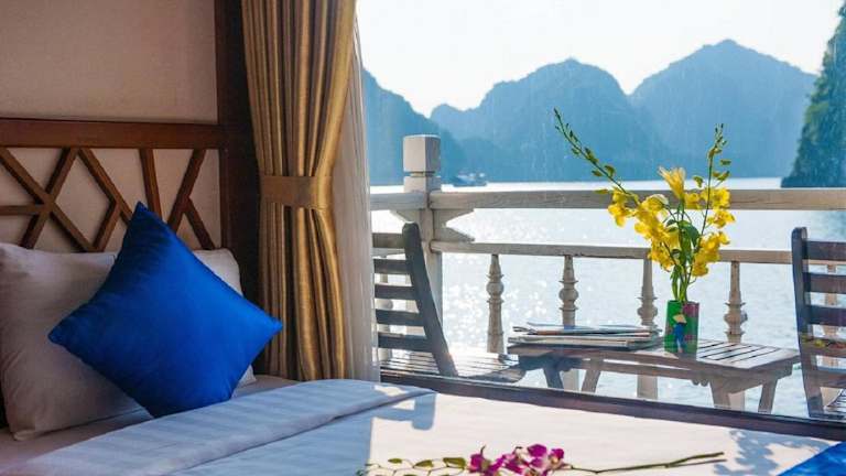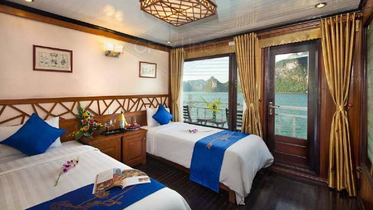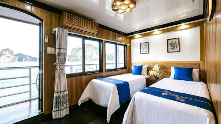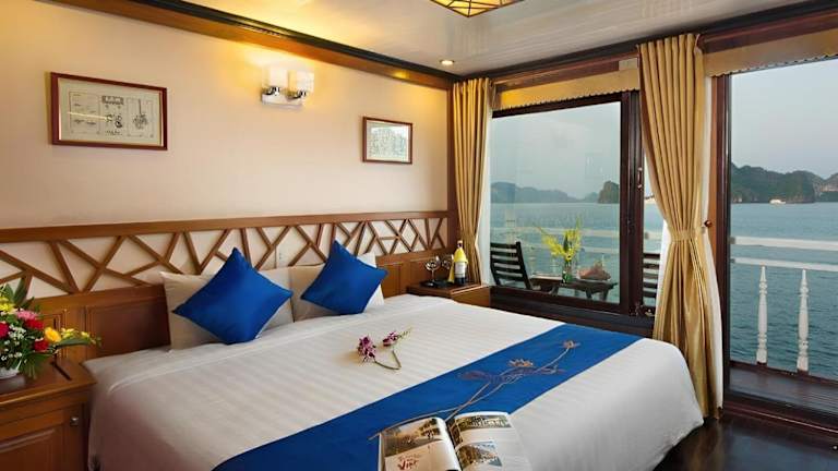 Die Royal Palace Cruise legt vom Kai Tuan Chau ab und bietet Ihnen die Möglichkeit, die atemberaubende Schönheit der Halong-Bucht zu erkunden. Von Ihrem Zimmer aus können Sie den Panoramablick auf das umliegende Meer und die Felsenformationen genießen.