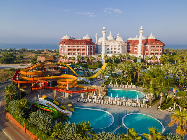 Das Royal Taj Mahal Hotel liegt direkt am hoteleigenen Sand-/Kiesstrand in der ersten Reihe und befindet sich im Bezirk Kumköy. Das Ortszentrum von Side ist etwa 5 km entfernt, der Flughafen Antalya ist ca. 48 km, Antalya etwa 50 km und Manavgat ca. 10 km entfernt.
