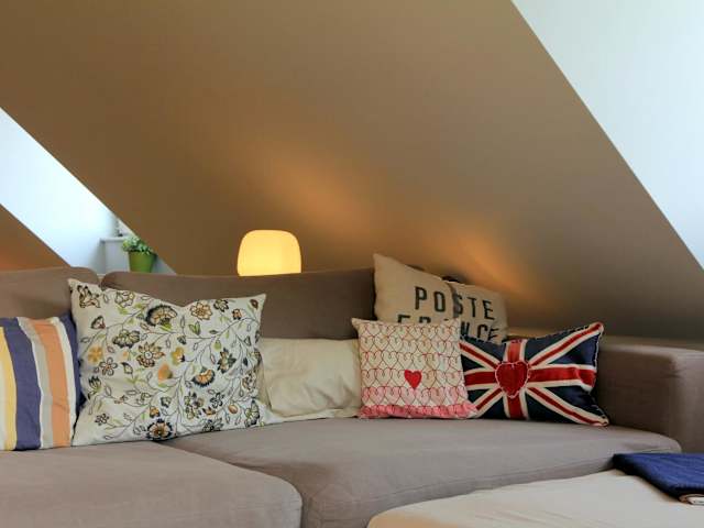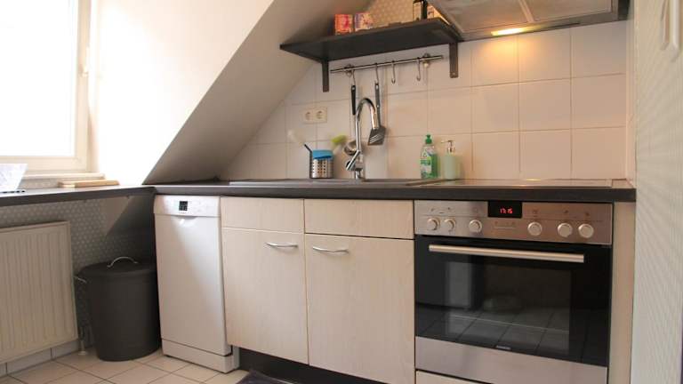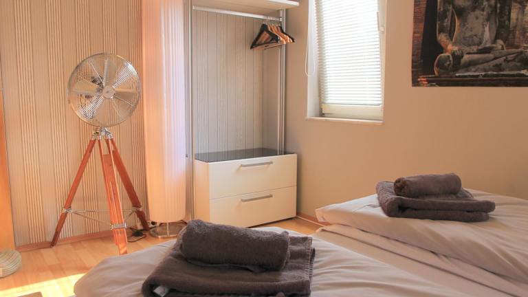 Die Wohnung verfügt über ein Schlafzimmer und ein Wohnzimmer. Zur Ausstattung gehören ein Flachbild-TV, eine gut ausgestattete Küche mit Kühlschrank und Geschirrspüler sowie ein Badezimmer mit Dusche. Ein Balkon mit Stadtblick ist ebenfalls vorhanden. Handtücher und Bettwäsche werden bereitgestellt.