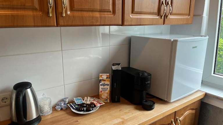 Es besteht die Möglichkeit zur Essenslieferung in die Unterkunft. In der Küche steht ein Kühlschrank und ein Ofen bereit, jedoch sind keine weiteren Details zu Verpflegungsmöglichkeiten vorhanden.