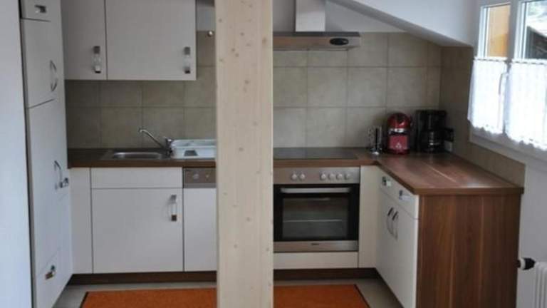 Die Ferienwohnung ist ausgestattet mit einem Fernseher. Die Küchenzeile enthält einen Kühlschrank, einen Geschirrspüler, einen Ofen sowie eine Kaffeemaschine.