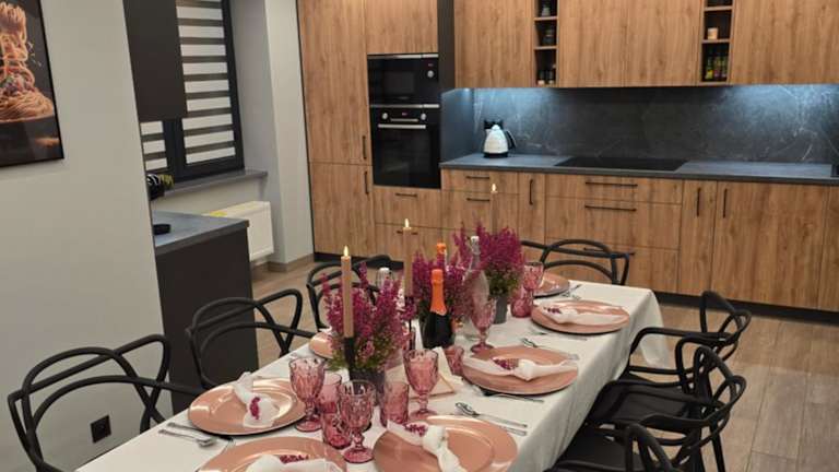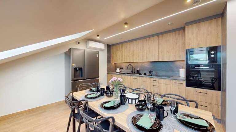 Jede Wohneinheit ist mit einer voll ausgestatteten Küche mit einem Esstisch ausgestattet, die Kühlschrank, Geschirrspüler, Ofen, Kaffeemaschine und Wasserkocher umfasst.