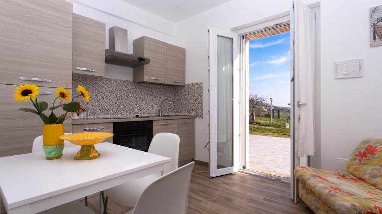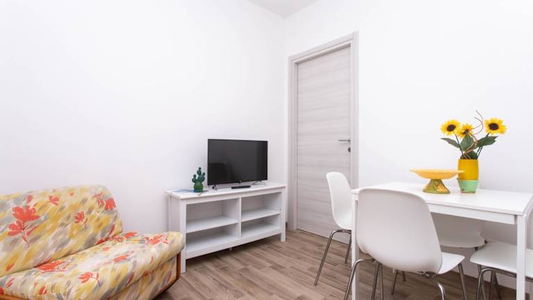 Das klimatisierte Apartment im nuovissimo bilocale con portico pt verfügt über ein separates Schlafzimmer, ein gemütliches Wohnzimmer und eine voll ausgestattete Küchenzeile mit Kühlschrank und Kochfeld. Das Apartment bietet Platz für einen komfortablen Aufenthalt und ist ideal für Paare oder kleine Familien. Handtücher und Bettwäsche können gegen Aufpreis zur Verfügung gestellt werden.