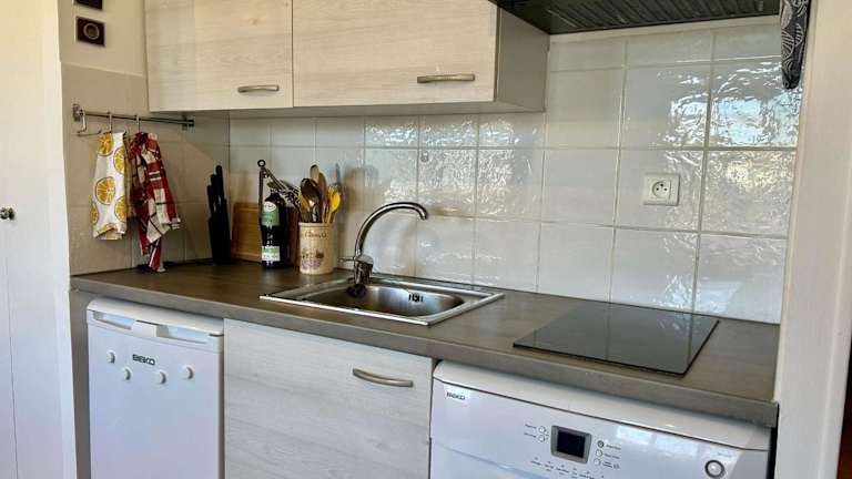 Die Ferienwohnung verfügt über ein Schlafzimmer, ein Wohnzimmer mit TV und eine gut ausgestattete Küche, die unter anderem einen Kühlschrank und einen Geschirrspüler umfasst. Zudem gibt es ein Badezimmer mit einer Dusche.