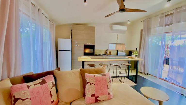 Das klimatisierte Ferienhaus verfügt über 2 Schlafzimmer, ein gemütliches Wohnzimmer und eine voll ausgestattete Küche mit Kühlschrank und Kaffeemaschine. Das Badezimmer ist mit einer Dusche und kostenlosen Pflegeprodukten ausgestattet. Handtücher und Bettwäsche werden im Ferienhaus gestellt, sodass Sie sich um nichts kümmern müssen.