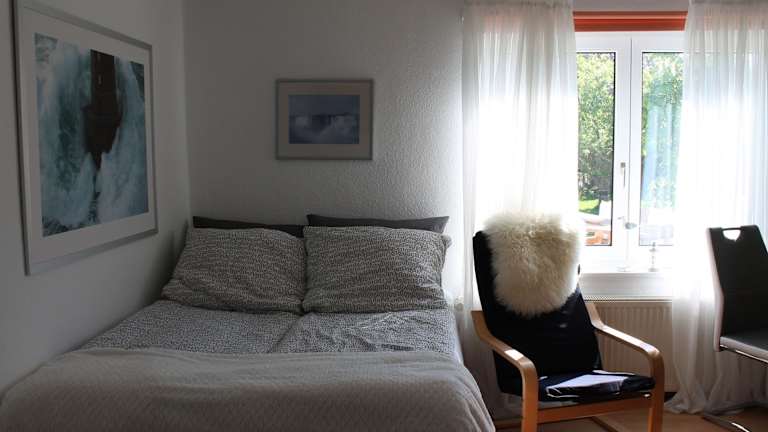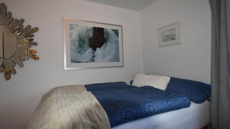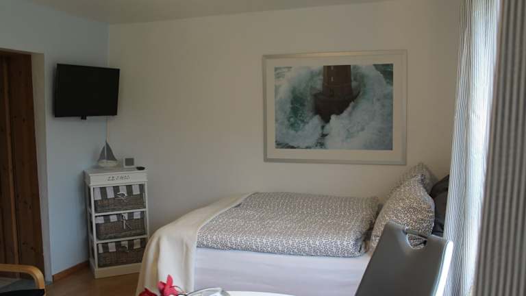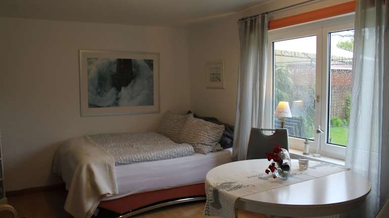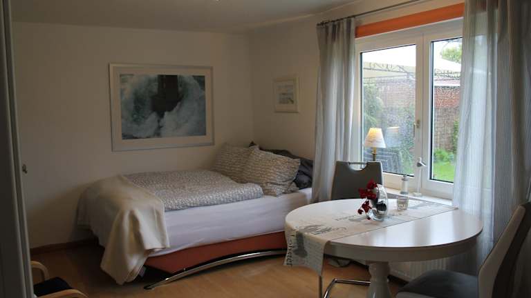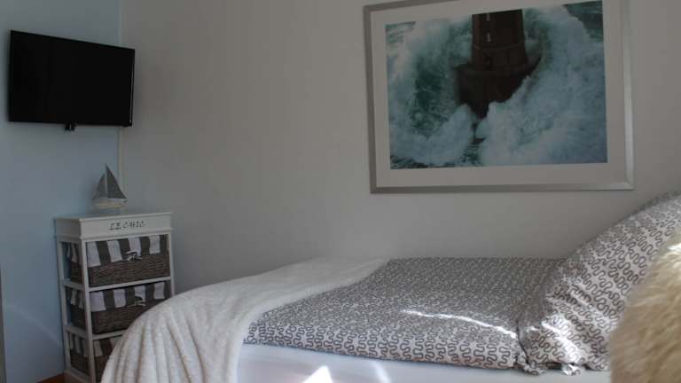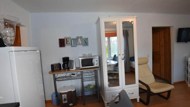 Die Ferienwohnung besteht aus einem Schlafzimmer und einem Wohnzimmer und ist ausgestattet mit einer voll ausgestatteten Küche, die einen Kühlschrank und einen Essbereich beinhaltet. Weiterhin verfügt die Wohnung über ein Badezimmer sowie einen TV mit Kabelkanälen, einen DVD-Player und einen CD-Player.