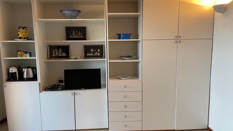 Die Ferienwohnung besteht aus 1 Schlafzimmer, 1 Badezimmer, einem Sitzbereich, einer Küchenzeile mit Kühlschrank und Toaster, sowie einem Flachbild-TV. Handtücher und Bettwäsche werden bereitgestellt. Die Unterkunft SAN TEODORO PUNTA EST GIARDINO VISTA MARe hat 2 Schlafzimmer, 2 Badezimmer, einen Essbereich, eine voll ausgestattete Küchenzeile und eine Terrasse mit Meerblick.