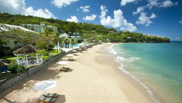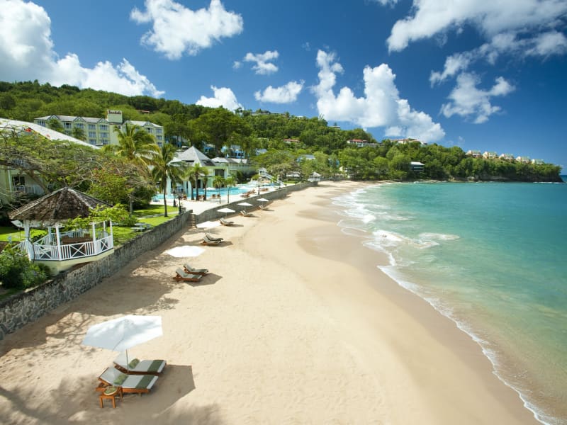 Austauschprogramm "Einmal bezahlen, dreifach genießen": Auf Saint Lucia erleben die Gäste gleich drei Sandals Resorts, denn hier gilt: einmal bezahlen, dreimal genießen. Urlauber wohnen in ihrem bevorzugten Sandals-Hotel und nutzen wie es ihnen beliebt das komplette Angebot der beiden anderen, maximal 30 Fahrminuten voneinander entfernten Anlagen des Sandals Grande St. Lucian und Sandals Halcyon. Dadurch stehen allen Sandals-Gästen drei Strände, 27 Restaurants und 21 Bars, zehn Pools und elf Whirlpools, der Golfplatz sowie die Nutzung des Shuttlebusses kostenfrei zur Verfügung. Hochzeitsarrangement Das Resort ist wie geschaffen für Hochzeitsreisende und Honeymooner: In einer außergewöhnlichen Überwasser-Kapelle mit traumhaften Ausblick auf die Rodney Bay können sich Brautpaare das Ja-Wort geben. Anschließend haben sie die einmalige Gelegenheit, ihre Flitterwochen in einem der sehr luxurösen Overwater-Bungalow zu verbringen. Die exklusiven Unterkünfte gehören zu den ersten Überwassersuiten der Karibik. Island Routes Saint Lucia bietet einige der schönsten Strände der Welt, aber es gibt viel mehr zu entdecken als Sand und Meer. Die Insel hat ganz besondere Eigenschaften und verdient es, mit einem der vielen Ausflüge, die Island Routes vor Ort anbieten, zu erkunden: vom Hochseefischen über Schwimmen mit Delfinen bis hin zu Katamarantouren und Ausritten zu Pferd oder mit dem Mountainbike. Verpassen Sie nicht die Chance, die echte Karibik abseits der ausgetretenen Pfade zu erkunden! Red Lane Spa Umgeben vom traumhaften Meer, erleben Sie einzigartige Momente. Entspannen Sie sich im preisgekrönten Red Lane® Spa mit einer verjüngenden Massage in einer privaten Cabana am Strand, am Pier am Meer oder in einer romantischen, entspannenden Oase für Paare. Die sanfte Brise streichelt Ihre sonnenverwöhnte Haut, während der hypnotische Klang der Wellen Ihre Seele beruhigt.