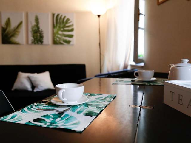 Die Ferienwohnung besteht aus einem Schlafzimmer und einem Wohnzimmer. Sie verfügt über ein Badezimmer mit Bidet und Dusche. Handtücher und Bettwäsche werden bereitgestellt. Darüber hinaus ist die Unterkunft klimatisiert und bietet Annehmlichkeiten wie Heizung, WLAN und einen privaten Check-in/-out.
