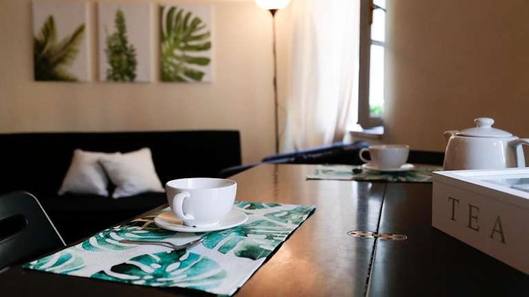 Die Ferienwohnung umfasst eine voll ausgestattete Küchenzeile mit Kühlschrank und Kaffeemaschine. Lebensmittellieferung ist gegen zusätzliche Gebühren verfügbar.