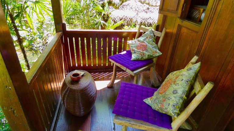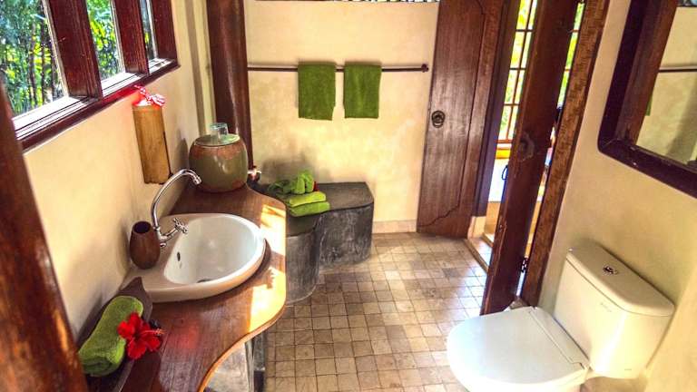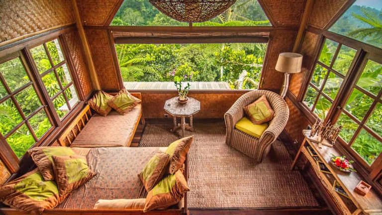 Die Zimmer der Sarinbuana Eco Lodge bieten Ihnen einen weiten Blick auf den Garten und die Berge. Jedes Zimmer verfügt über eine Terrasse oder einen Balkon mit einem gemütlichen Sitzbereich, ideal zum Entspannen und Genießen der natürlichen Umgebung. Alle Zimmer sind mit einem eigenen Bad ausgestattet und bieten Ihnen Komfort und Privatsphäre während Ihres Aufenthalts.