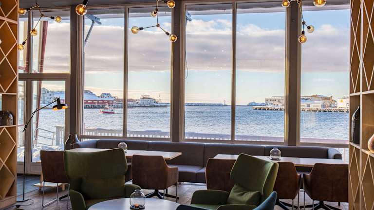 Das Hotelrestaurant und die Bar befinden sich in einem einzigartigen, bootförmigen Gebäude und bieten einen Panoramablick auf den Hafen und die umliegenden Berge. Hier können Sie köstliche Speisen und erfrischende Getränke genießen, während Sie das vorbeifahrende Hurtigruten-Schiff beobachten.