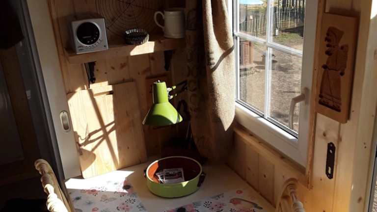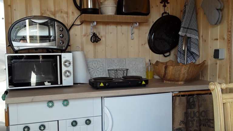 Das Ferienhaus im Hotel Schäferwagen auf'm Minibauernhof verfügt über ein gemütliches Schlafzimmer, eine voll ausgestattete Küche mit Kühlschrank und Backofen sowie ein eigenes Badezimmer mit Dusche. Handtücher und Bettwäsche werden gestellt, um Ihnen einen angenehmen Aufenthalt zu ermöglichen.