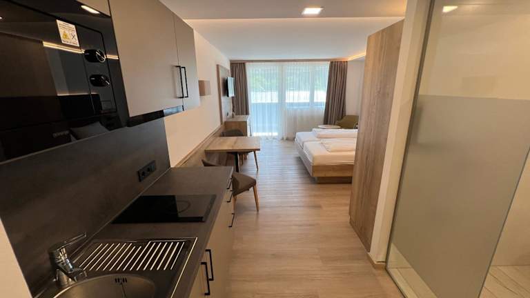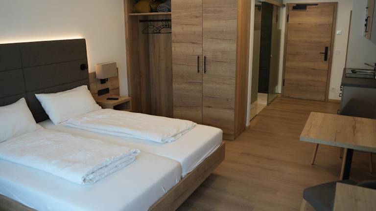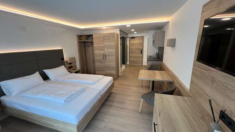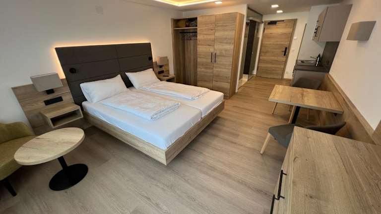 Die Zimmer sind mit einem Balkon mit Bergblick und kostenlosem WLAN ausgestattet. Jedes Zimmer verfügt über einen Kleiderschrank, einen Flachbild-TV und ein eigenes Badezimmer mit Dusche. Einige Zimmer sind zusätzlich mit einer Küchenzeile und einem Kühlschrank ausgestattet.
