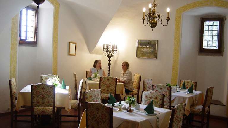 Das Schloss Englar bietet keine Verpflegung vor Ort an. In der Umgebung gibt es jedoch eine Vielzahl von Restaurants und Cafés, in denen Sie lokale Spezialitäten und Weine genießen können. Das Personal des Hotels gibt Ihnen gerne Empfehlungen für Restaurants in der Umgebung.