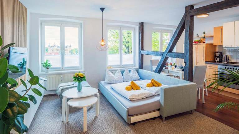 Die Unterkunft befindet sich ungefähr 700 m vom Mecklenburgischen Staatstheater Schwerin sowie vom Staatlichen Museum Schwerin entfernt. In der Nähe sind Sehenswürdigkeiten wie das Schweriner Schloss, die Sport- und Kongresshalle Schwerin und der Hauptbahnhof Schwerin zu finden. Der nächstgelegene Flughafen ist der Flughafen Lübeck, der sich 73 km entfernt befindet.